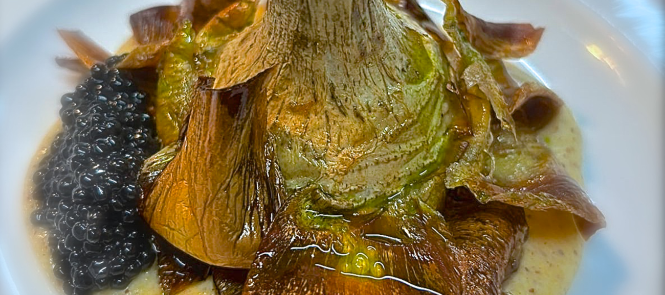Polentina umbra macinata a pietra con croccante di carciofo, olio alla menta e caviale di aringa